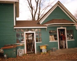The side porch, a little further up the driveway, was once an open porch trimmed in gingerbread woodwork. It was about half the size it is today. There was also an entrance to the summer kitchen, or basement, which was visible on the old wood siding as an outline.