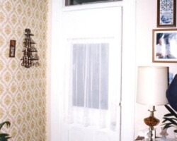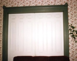 Turning to your left, you will enter the front parlor. The eleven foot high ceilings lend a formal air to the parlours and dining room. The eight foot windows are beautifully and elaborately trimmed, with moldings on panels beneath. The trim work is in the Eastlake style, which was popular with its lines and geometric shapes. A furniture maker in the late 1860’s, by the last name of Eastlake, used at least three parallel lines in his designs, circles and zigzags. Any less than 3 lines means the piece of furniture, or trim work in this case, could’ve been built in a later time period. This fact leads me to believe the house had to be built around 1875. Anyway, the trim work and doors are made of a fine quality white pine. Originally, they were finished with a honey coloured stain and had a graining technique applied to them. This graining technique was also popular during this particular era. It could give a plain wood, like pine, the rich look of a nicely grained wood such as oak. I guess it would be an inexpensive way of getting the look you want without the cost. The unfortunate part about this is, that with the wear and tear over the years, it must’ve gotten chipped and worn looking. So then they must’ve decided to freshen it up with paint. These would be hard to strip down and refinish unless you had a gentle but effective way to do it without gouging the grooves, pine being such a soft wood. The front parlour would’ve been the room where they would’ve lain out their deceased for viewing as such was the custom in the early days. A morbid thought to us nowadays. This room did have bookcases from floor to almost the ceiling. When we had the wallpaper stripped down you could see the outlines of them. Apparently, our Mr. Brown had them taken down and sent down to the local high