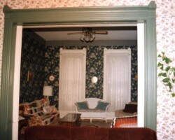school. The windows had interior shutters as can be seen in photographs. And curtain hung over them. The flooring originally was a burgundy wool carpet with a leaf design in a lighter shade. It was a wall to wall and also covered the middle parlour. Note the generous eleven inch baseboards.